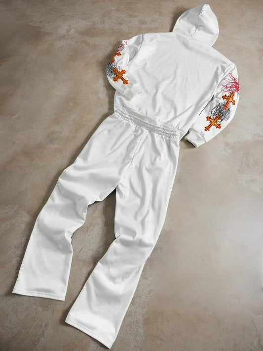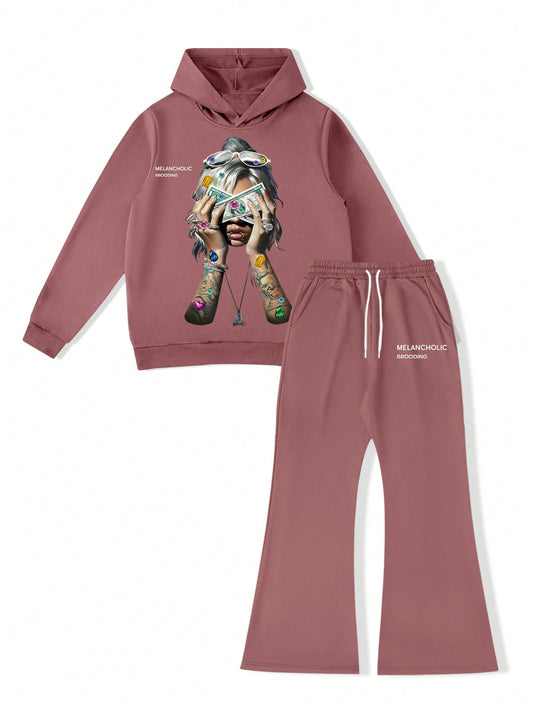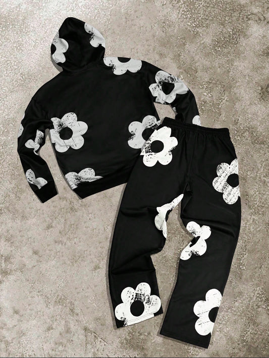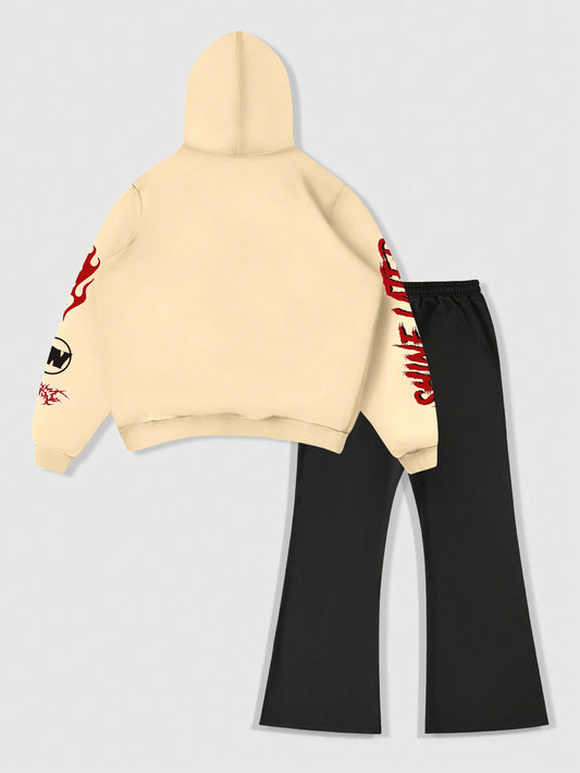 Manfinity EMRG Men's Youthful Street Style, Featuring A High Street Niche Creative Hoodie Set With Fun Graffiti All-Over Print And Rhinestone Embroidery. This Outfit Includes Slightly Flared Pants And Incorporates Flame Cross Elements With Oversized Grap