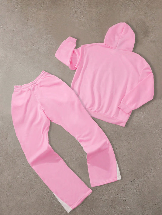 Manfinity EMRG Young Men's Streetwear Fun Cartoon Characters Hip Hop Black Graffiti Letter Print Hoodie And Patchwork Pants 2-Piece Set ,INS Pink Hooded Pullover Sweatshirt And Pants Set ,Men Two Piece Outfits ,Men Tracksuit ,Oversized Graphic