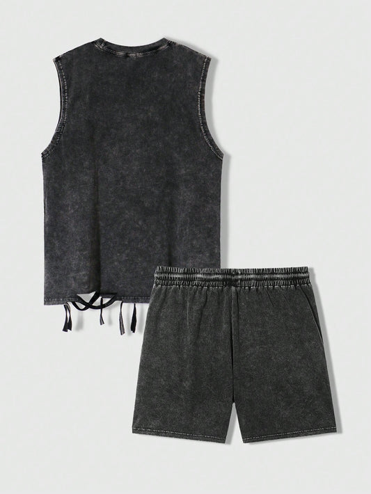 ROMWE Grunge Punk Men Punk Cross & Lip Print Round Neck Tank Top And Shorts Set, Minimalist