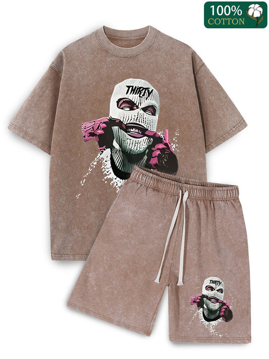 Men's Vintage-Inspired "THIRTY" Graphic Cotton Tee & Shorts Set - Comfortable, Thick Summer Wear with Cool Portrait Print, Elastic Waistband, and Drawstring - Casual Gray Colorblock Outfit