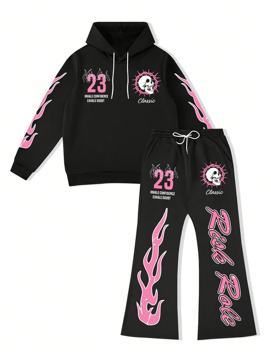 Men's Flame Graphic Hoodie & Sweatpants Set - "FIRE" 23 Print, Casual Streetwear, Polyester Blend, Machine Washable, 2pcs Tracksuit for Autumn/Winter, Essential Hoodie
