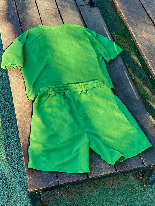 Manfinity EMRG Men's Young Street Style INS Item Green Short Sleeve Crew Neck T-Shirt Set With Fun 3D Towel Embroidery Craft Of Heart And Star Pattern, Loose Fit With Shorts. Men Two Piece Outfits ,Green