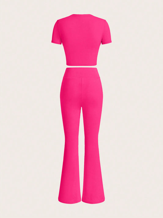 Slaydiva Simple Leisure Round Neck Crop Sleeve Top & Flared Long Pants 2pcs/Set Cropped Shirt & Trousers Printed With Cross Pattern For Women