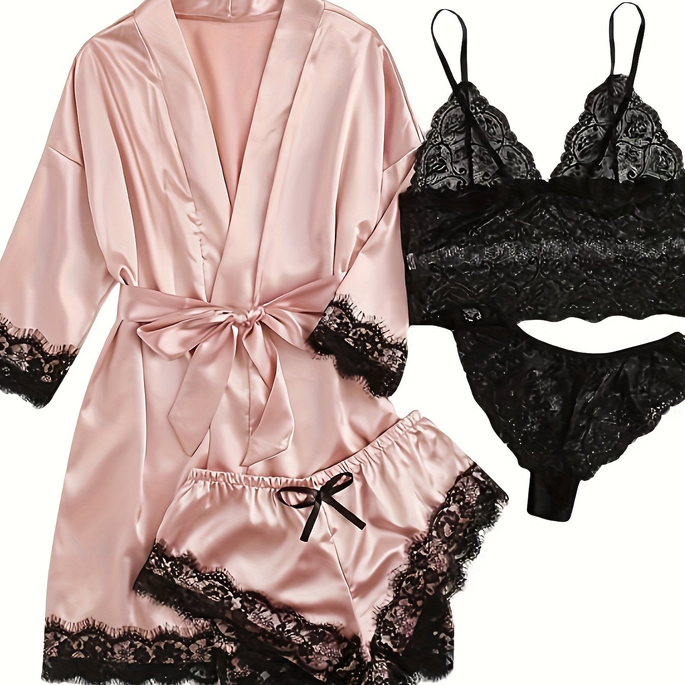 Women's 4-Piece Sleepwear Set, Three Quarter Sleeve Robe & V Neck Crop Cami Top & Panty & Mini Shorts
